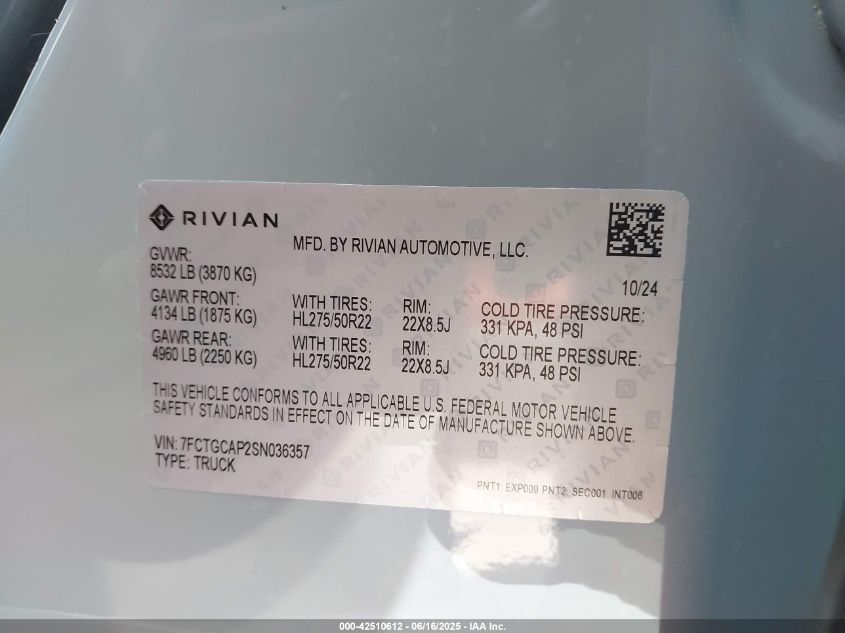 2025 RIVIAN R1T | 7FCTGCAP2SN036357