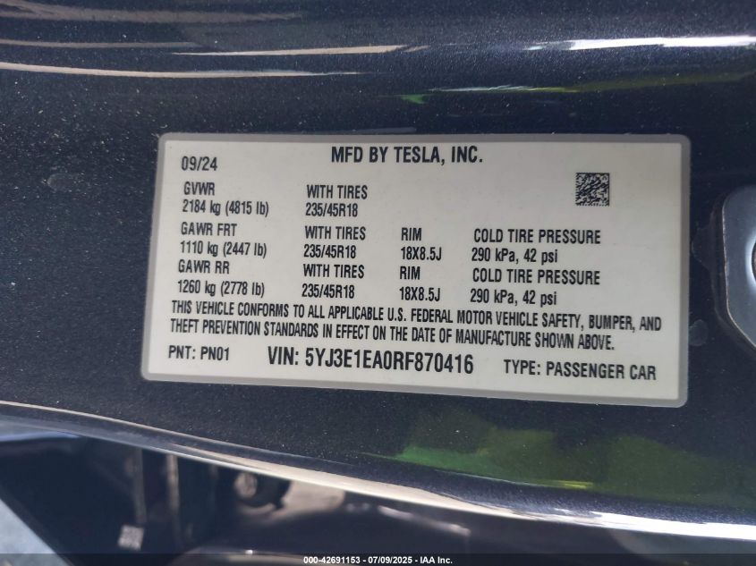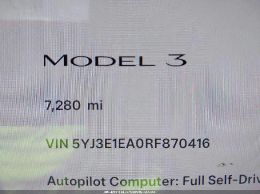 2024 TESLA MODEL 3 | 5YJ3E1EA0RF870416