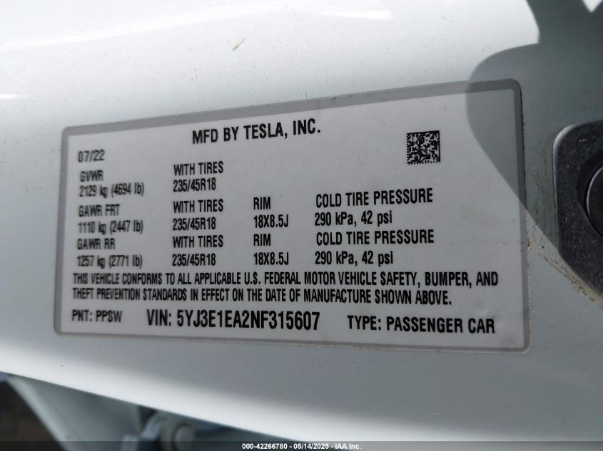 2022 TESLA MODEL 3 | 5YJ3E1EA2NF315607
