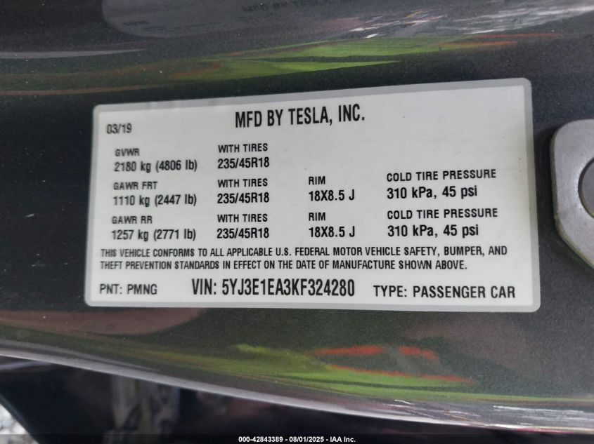 2019 TESLA MODEL 3 | 5YJ3E1EA3KF324280