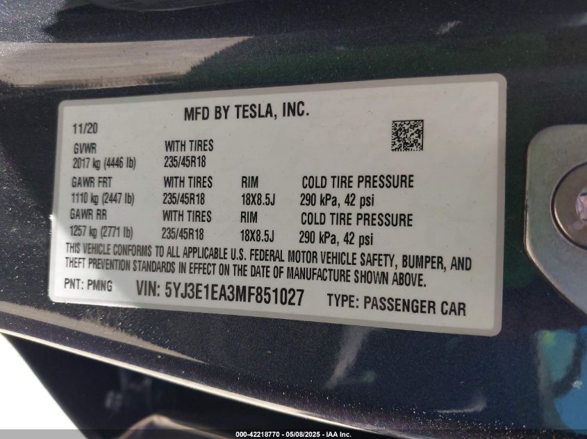 2021 TESLA MODEL 3 | 5YJ3E1EA3MF851027