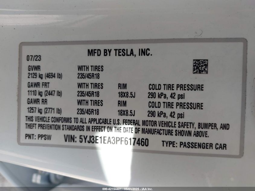 2023 TESLA MODEL 3 | 5YJ3E1EA3PF617460