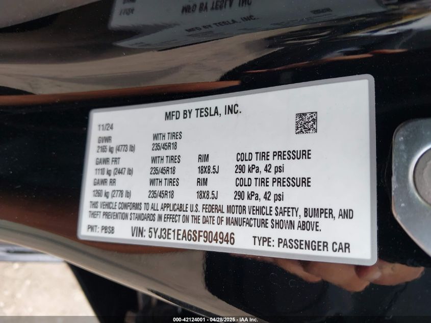 2025 TESLA MODEL 3 | 5YJ3E1EA6SF904946