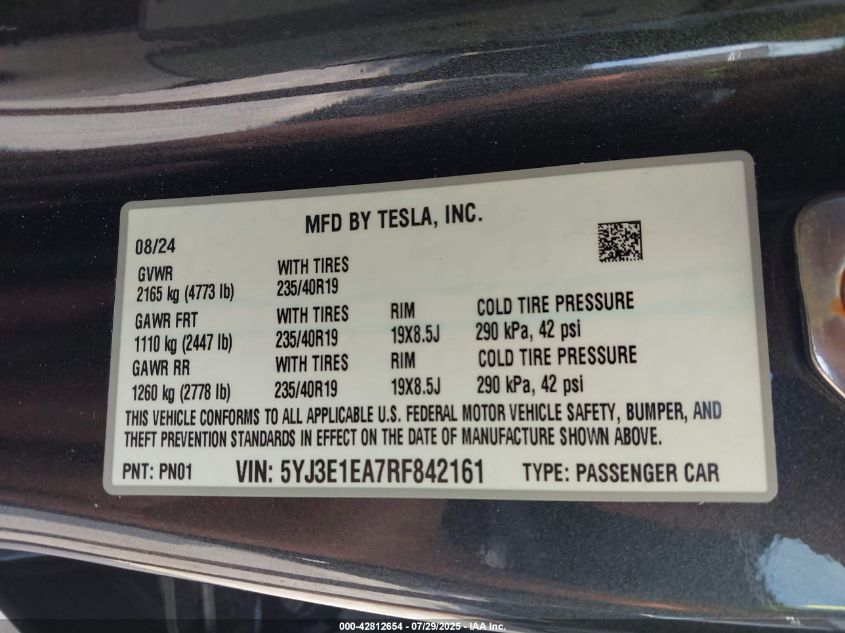 2024 TESLA MODEL 3 | 5YJ3E1EA7RF842161