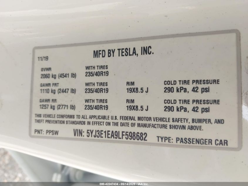 2020 TESLA MODEL 3 | 5YJ3E1EA9LF598682