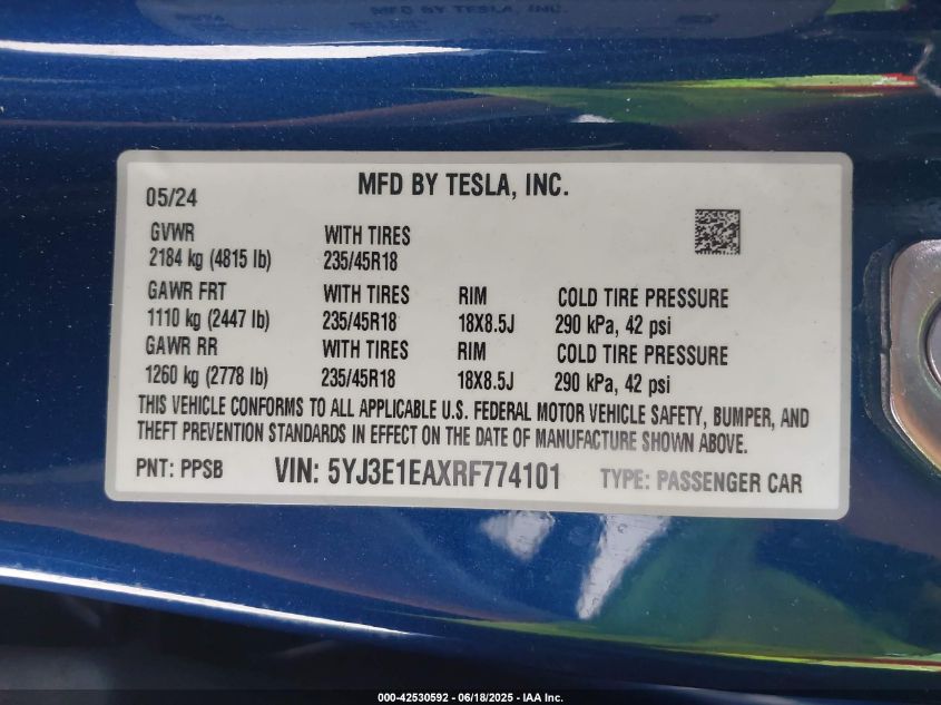2024 TESLA MODEL 3 | 5YJ3E1EAXRF774101