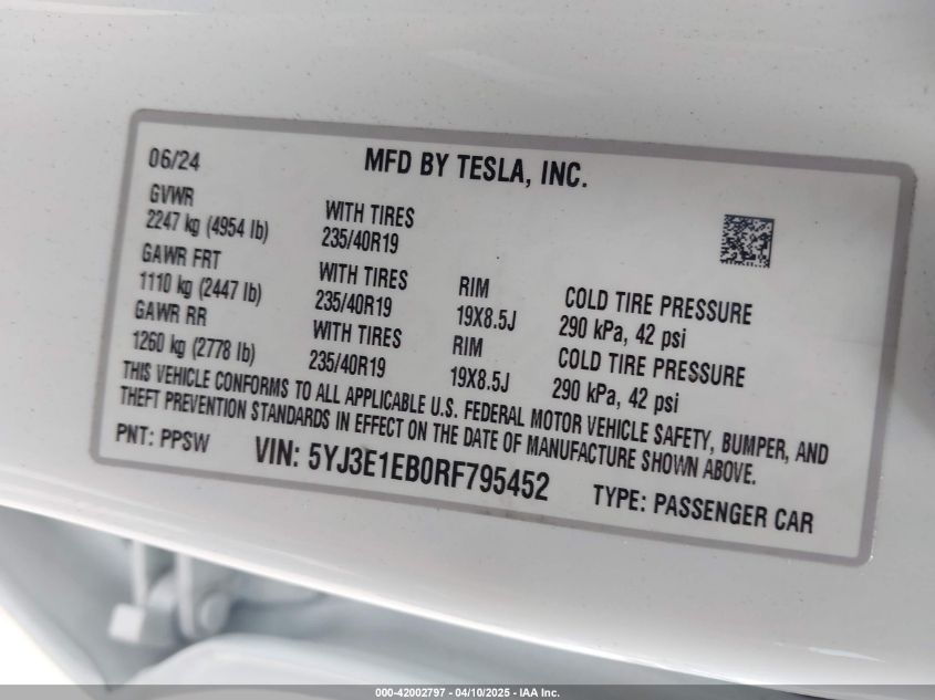 2024 TESLA MODEL 3 | 5YJ3E1EB0RF795452
