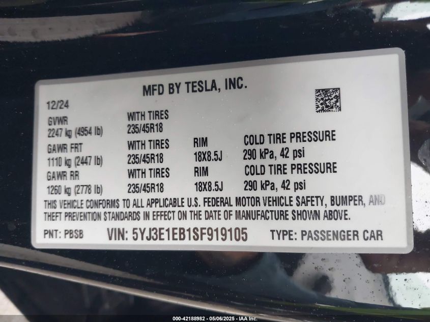 2025 TESLA MODEL 3 | 5YJ3E1EB1SF919105