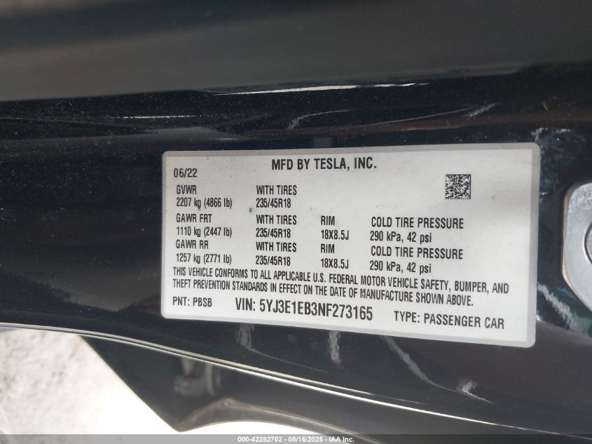 2022 TESLA MODEL 3 | 5YJ3E1EB3NF273165