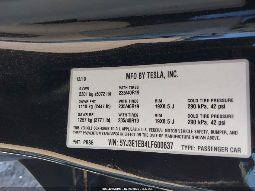 2020 TESLA MODEL 3 | 5YJ3E1EB4LF600637