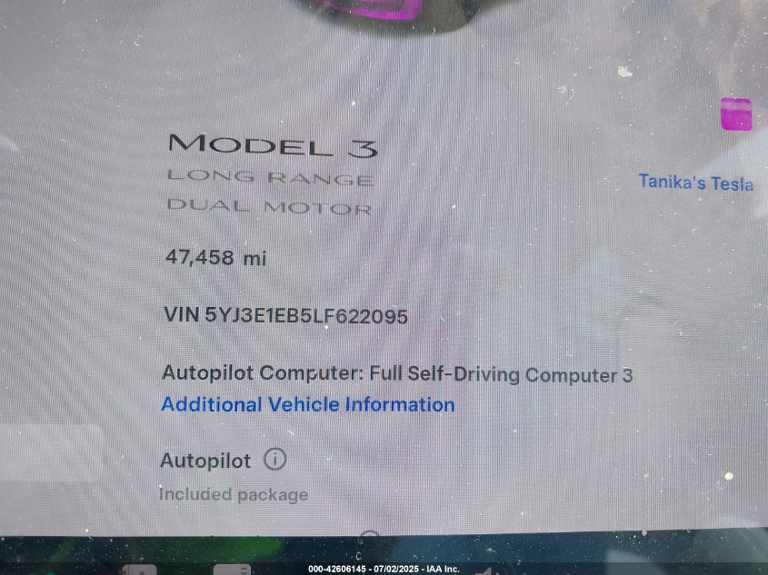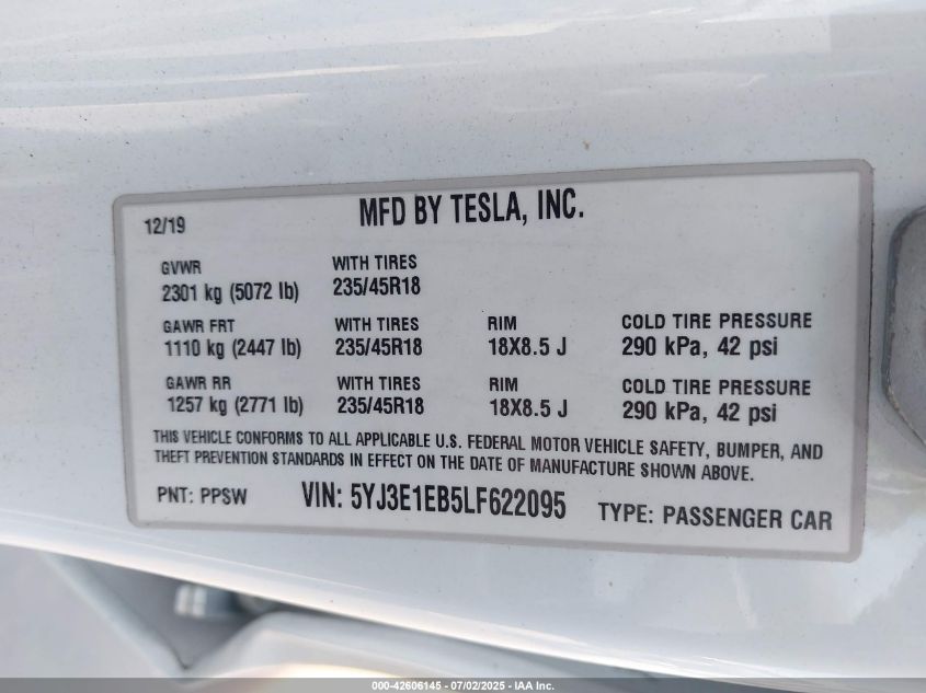 2020 TESLA MODEL 3 | 5YJ3E1EB5LF622095