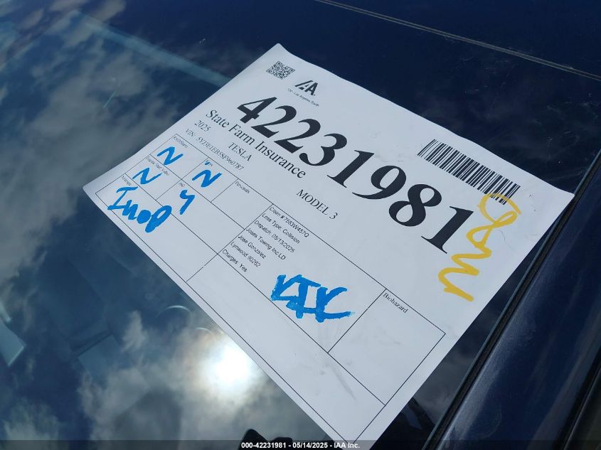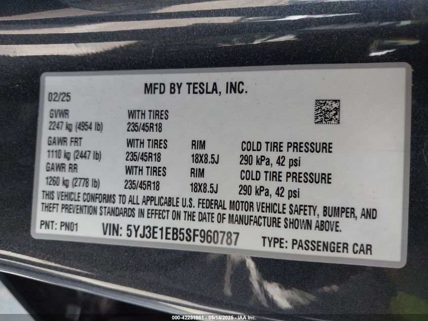 2025 TESLA MODEL 3 | 5YJ3E1EB5SF960787