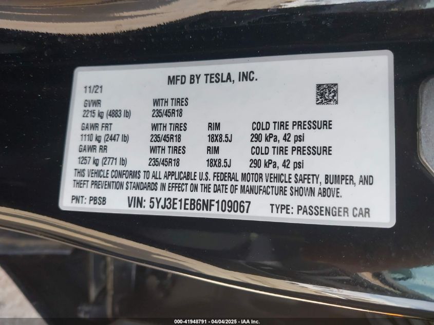 2022 TESLA MODEL 3 | 5YJ3E1EB6NF109067