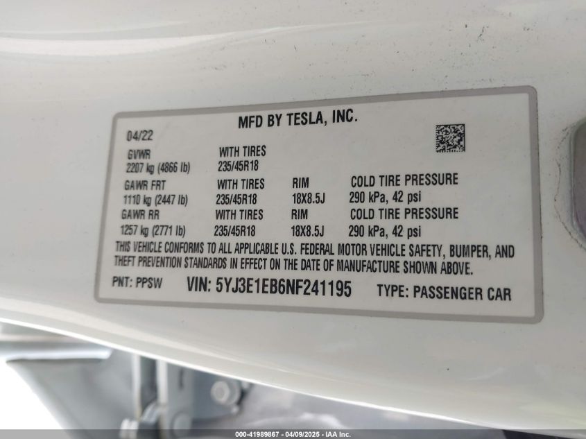 2022 TESLA MODEL 3 | 5YJ3E1EB6NF241195