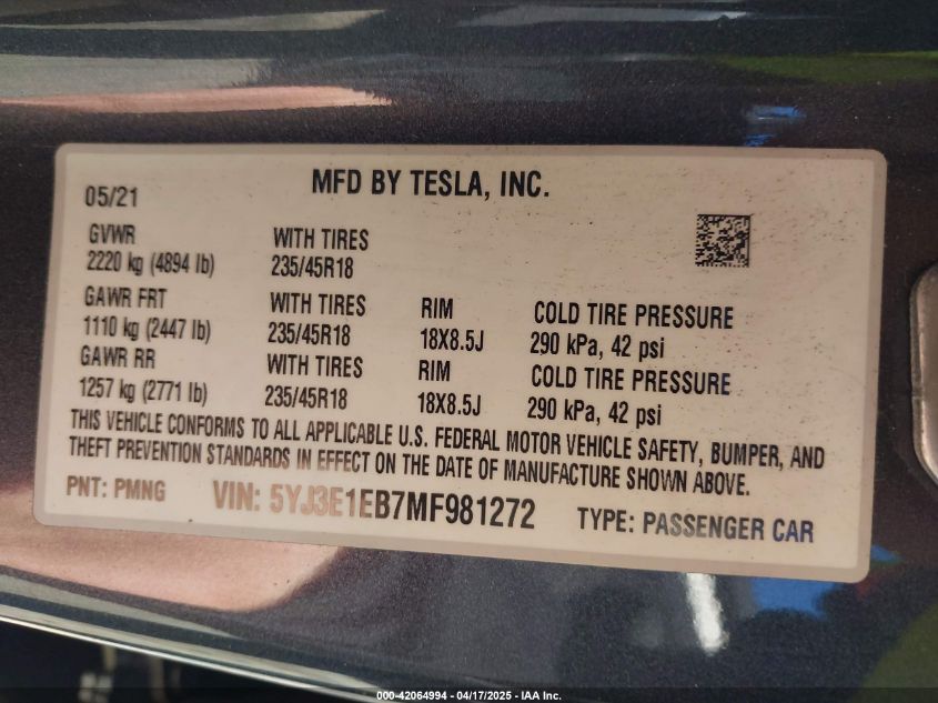 2021 TESLA MODEL 3 | 5YJ3E1EB7MF981272