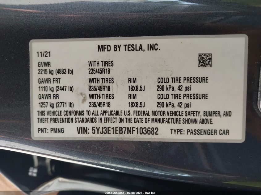 2022 TESLA MODEL 3 | 5YJ3E1EB7NF103682