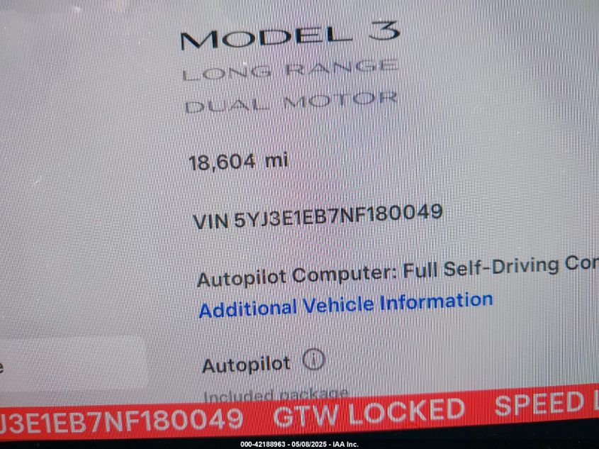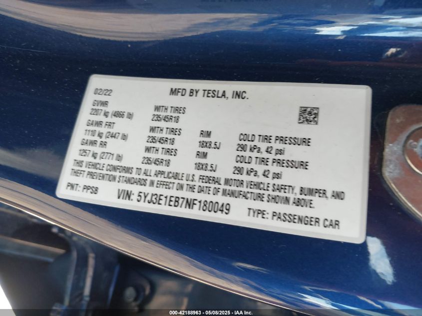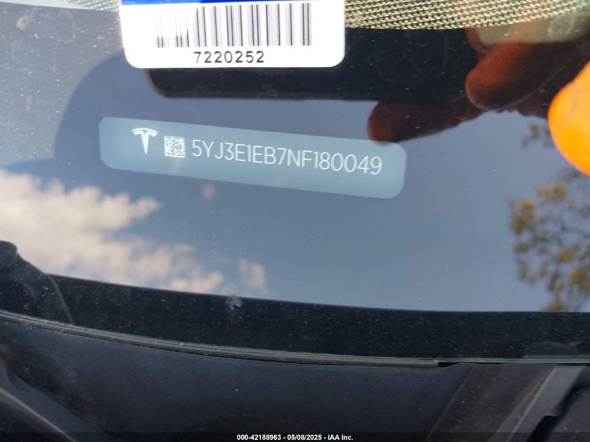 2022 TESLA MODEL 3 | 5YJ3E1EB7NF180049