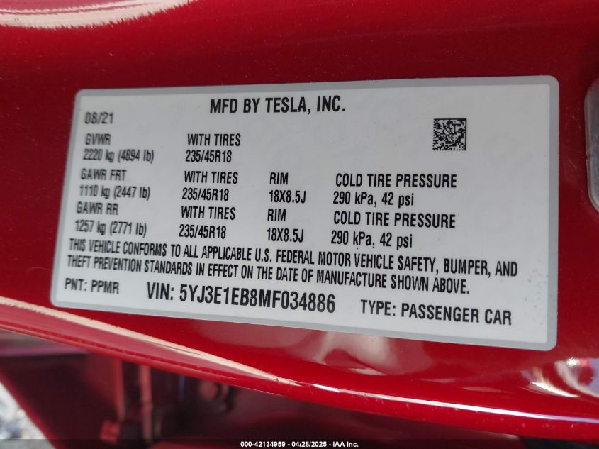 2021 TESLA MODEL 3 | 5YJ3E1EB8MF034886