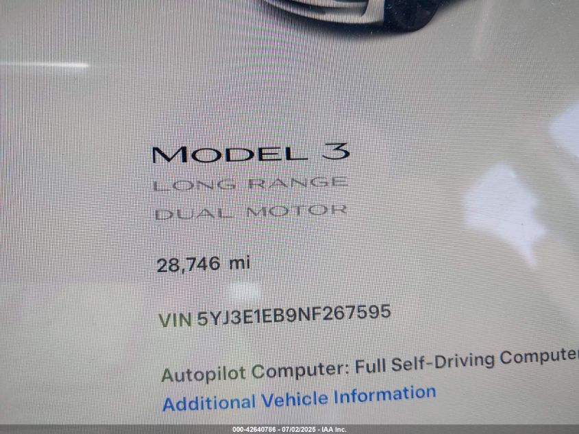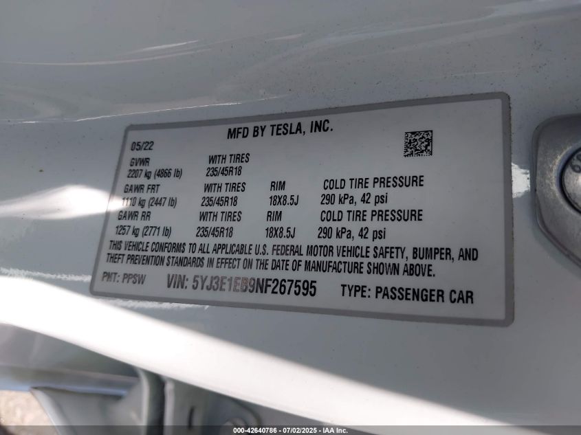 2022 TESLA MODEL 3 | 5YJ3E1EB9NF267595