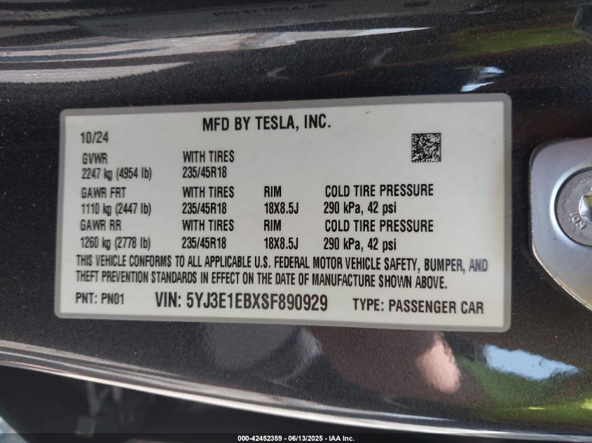 2025 TESLA MODEL 3 | 5YJ3E1EBXSF890929