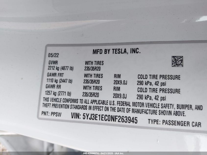 2022 TESLA MODEL 3 | 5YJ3E1EC0NF263945