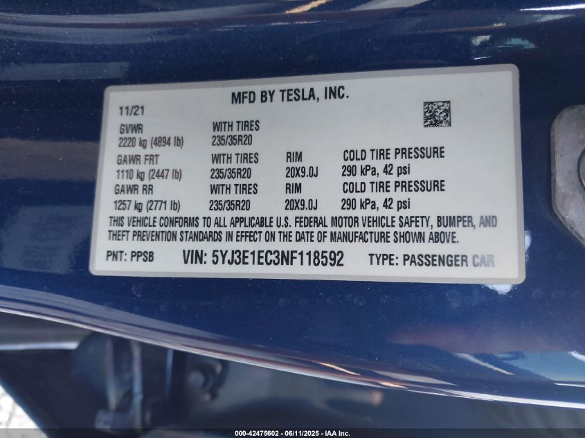 2022 TESLA MODEL 3 | 5YJ3E1EC3NF118592