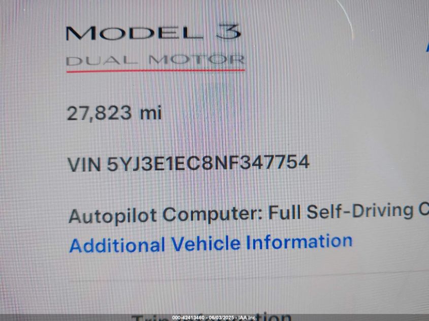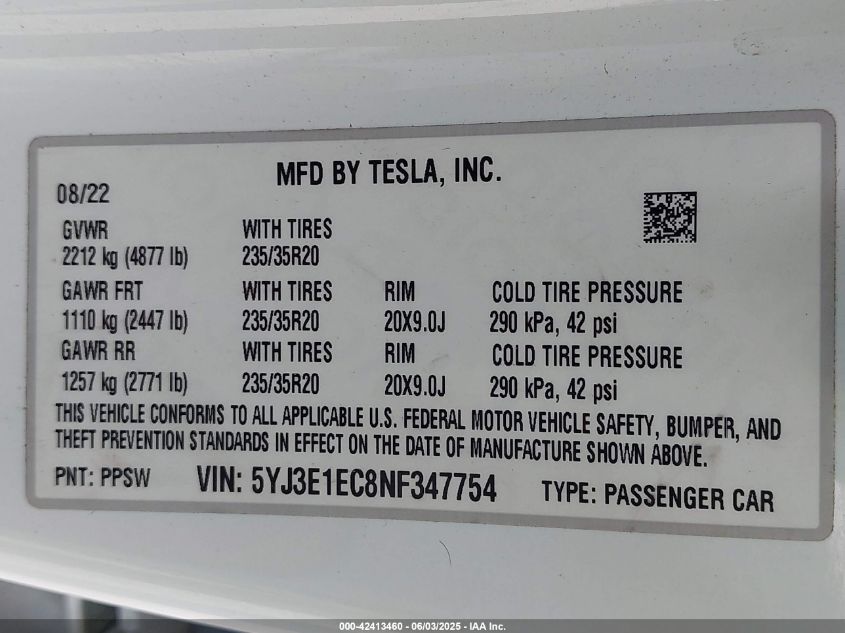 2022 TESLA MODEL 3 | 5YJ3E1EC8NF347754