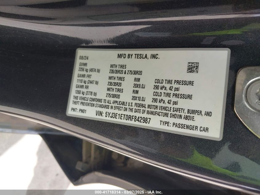2024 TESLA MODEL 3 | 5YJ3E1ET0RF842987