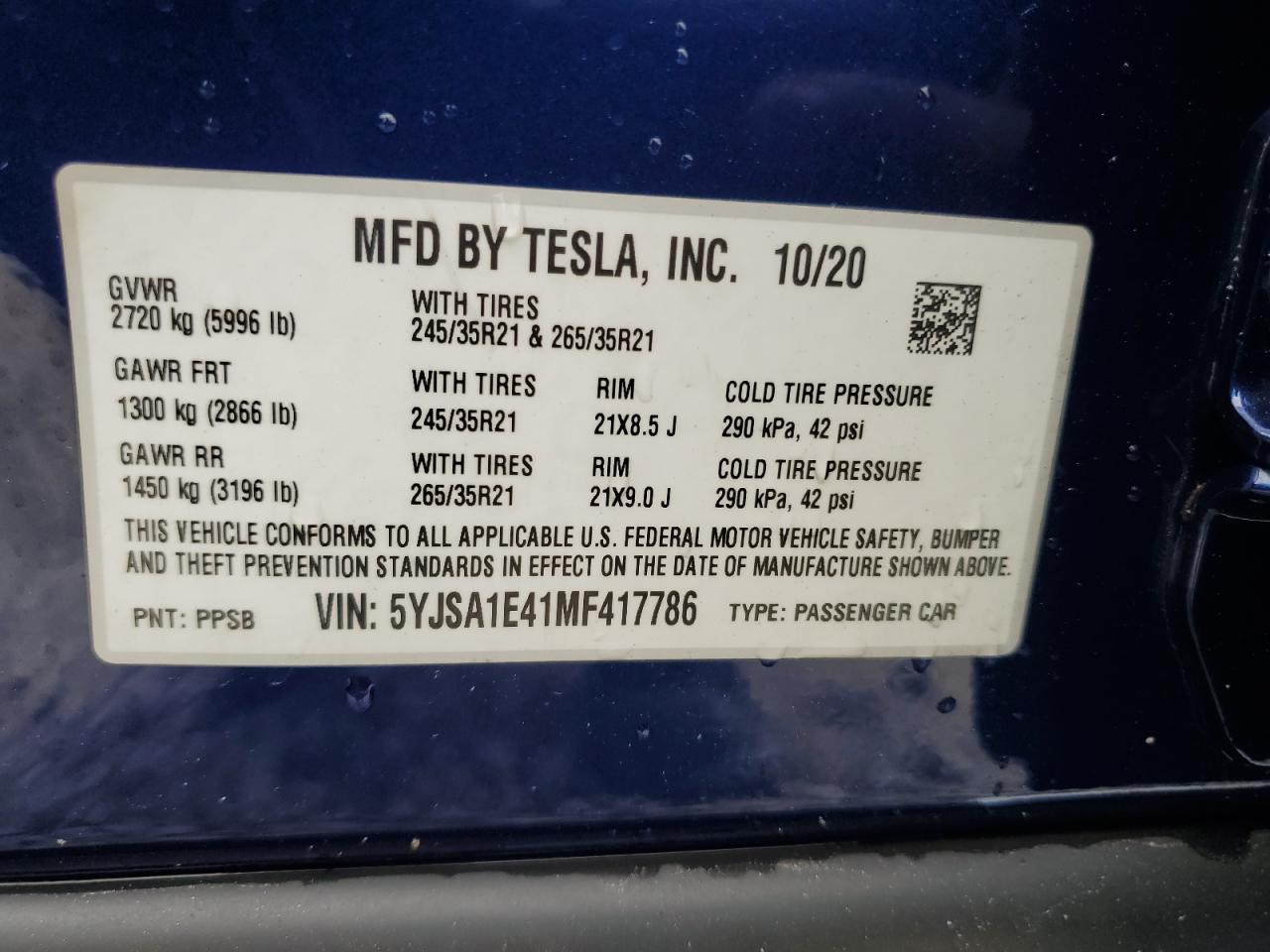 2021 TESLA MODEL S | 5YJSA1E41MF417786