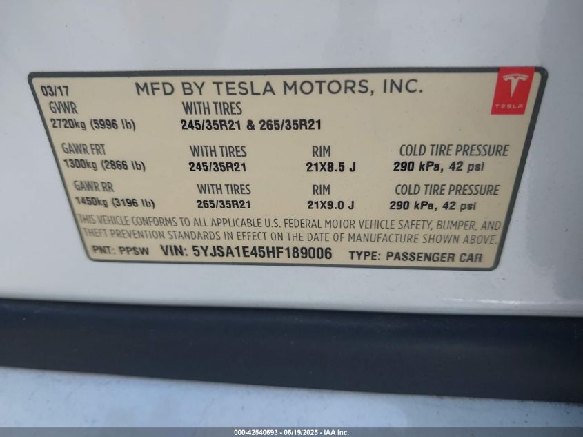 2017 TESLA MODEL S | 5YJSA1E45HF189006