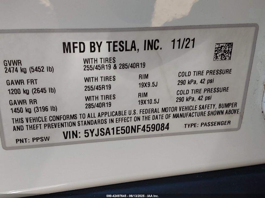 2022 TESLA MODEL S | 5YJSA1E50NF459084