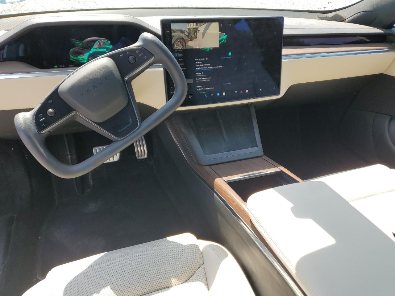 Inside, the Model S cabin features a clean, futuristic layout, with nearly all functions operated via the center touchscreen and digital driver display. The 2021 interior refresh introduced a yoke-style steering control (with optional round steering wheel), a landscape-oriented 17-inch touchscreen, and a rear-seat infotainment display. Interior themes include All Black, Black and White, and Cream, all trimmed in vegan leather (Tesla’s proprietary premium material) with wood, carbon fiber, or satin metallic accents depending on the configuration. The minimalist design is accented with ambient lighting, a glass roof, and hidden air vents that provide a sleek and uncluttered feel. Heated and ventilated seats, a premium audio system, and HEPA filtration come standard on upper trims.