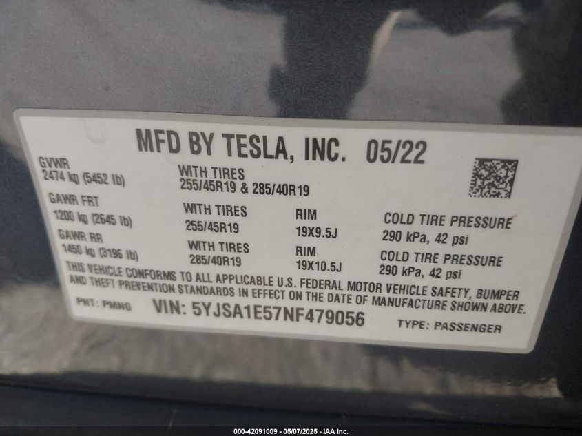 2022 TESLA MODEL S | 5YJSA1E57NF479056