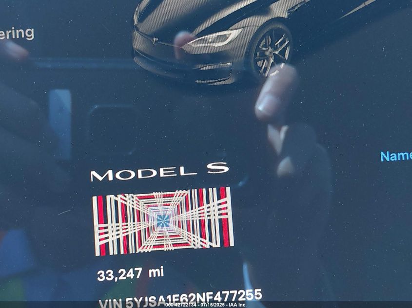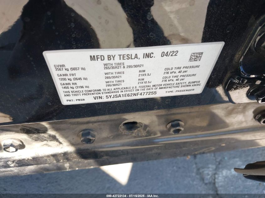 2022 TESLA MODEL S | 5YJSA1E62NF477255
