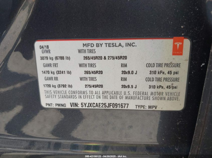 2018 TESLA MODEL X | 5YJXCAE25JF091677