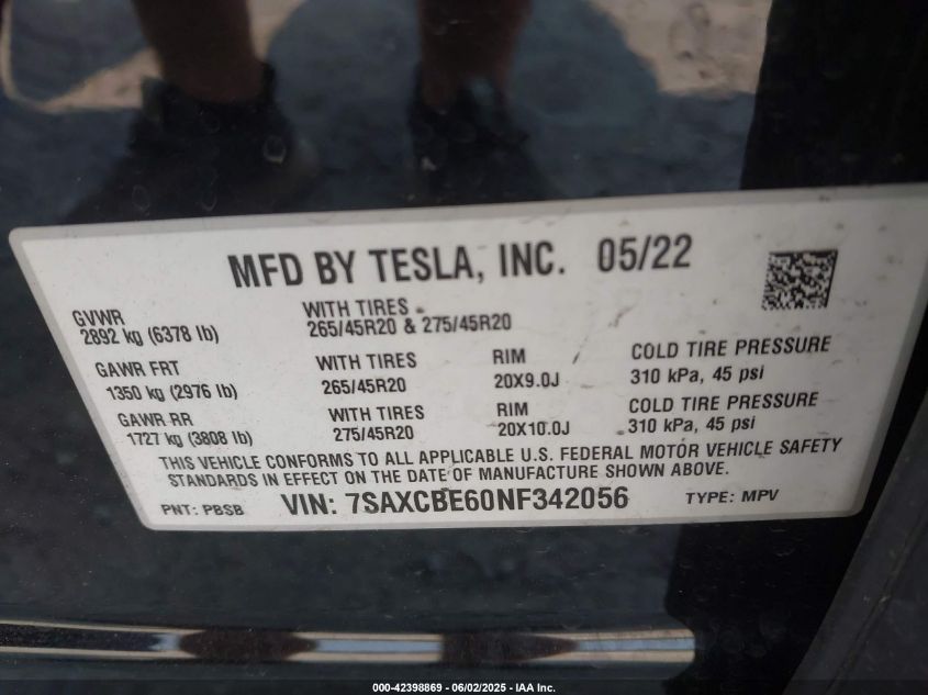 2022 TESLA MODEL X | 7SAXCBE60NF342056