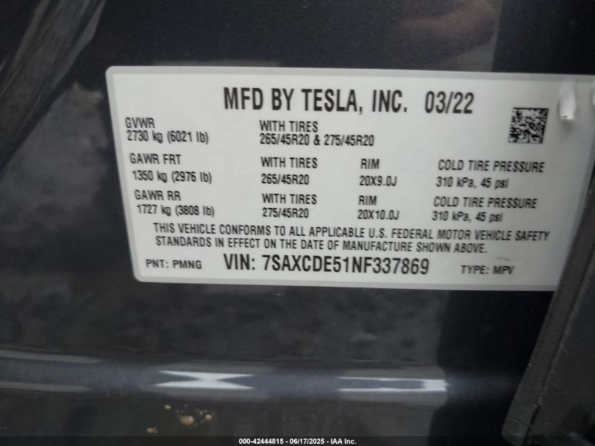 2022 TESLA MODEL X | 7SAXCDE51NF337869
