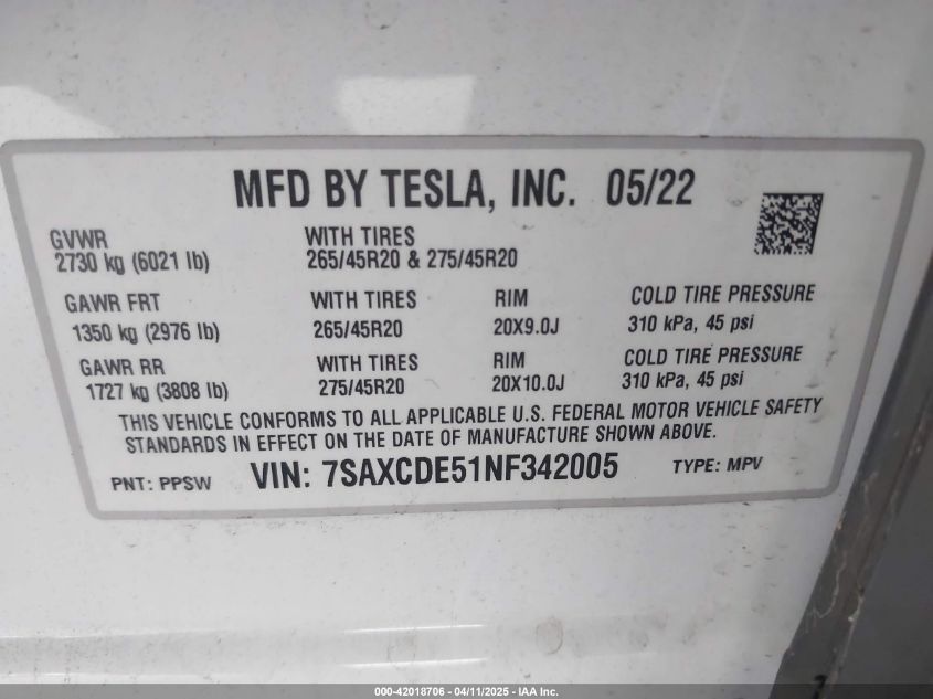2022 TESLA MODEL X | 7SAXCDE51NF342005