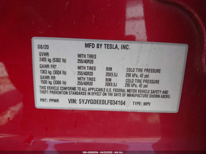 2020 TESLA MODEL Y | 5YJYGDEE0LF034164