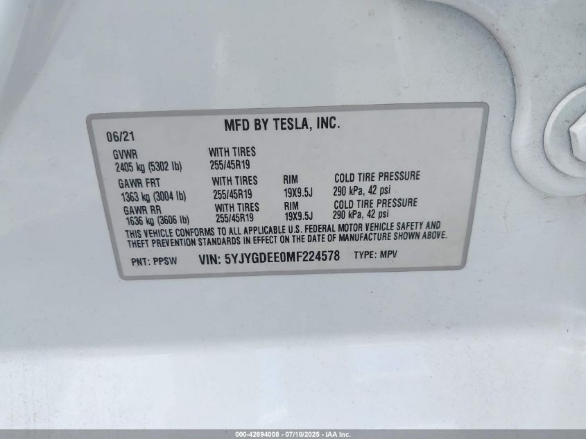 2021 TESLA MODEL Y | 5YJYGDEE0MF224578