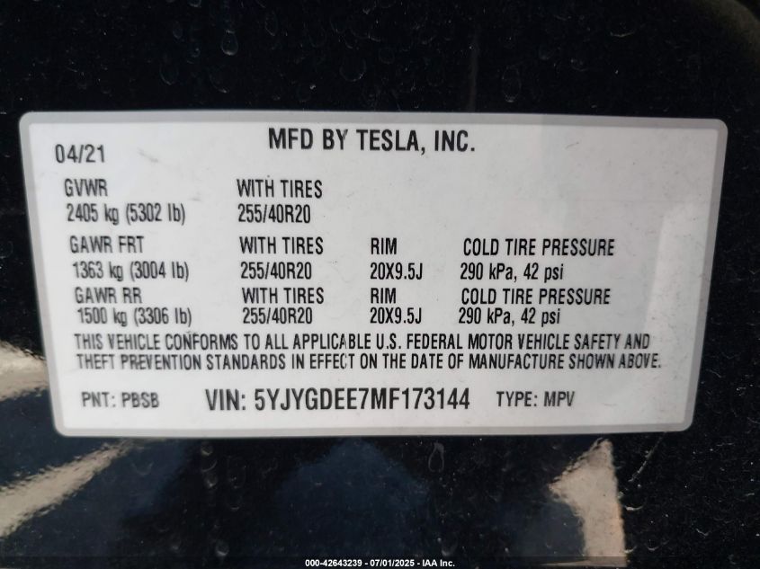 2021 TESLA MODEL Y | 5YJYGDEE7MF173144