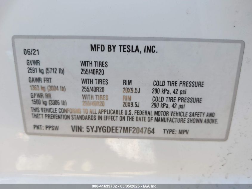 2021 TESLA MODEL Y | 5YJYGDEE7MF204764