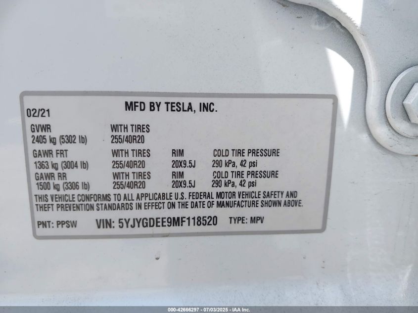 2021 TESLA MODEL Y | 5YJYGDEE9MF118520