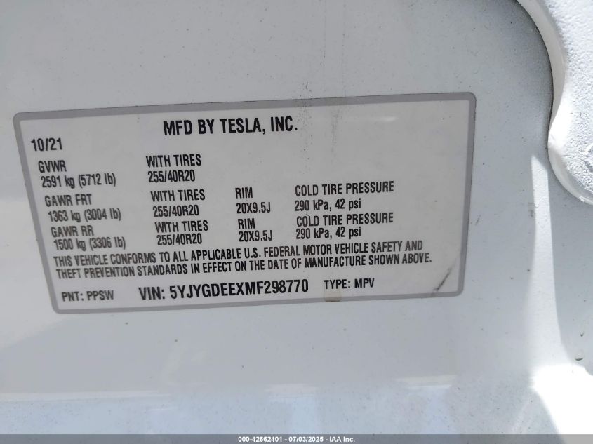 2021 TESLA MODEL Y | 5YJYGDEEXMF298770