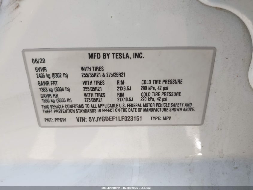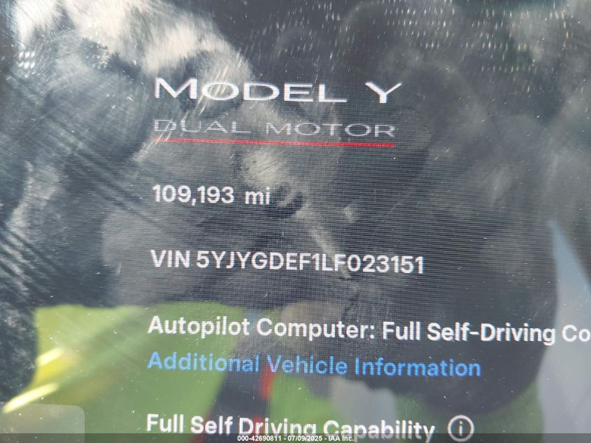 2020 TESLA MODEL Y | 5YJYGDEF1LF023151