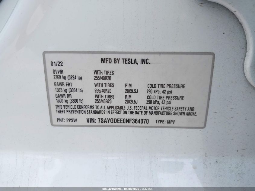 2022 TESLA MODEL Y | 7SAYGDEE0NF364070
