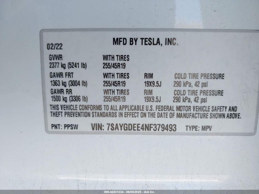 2022 TESLA MODEL Y | 7SAYGDEE4NF379493