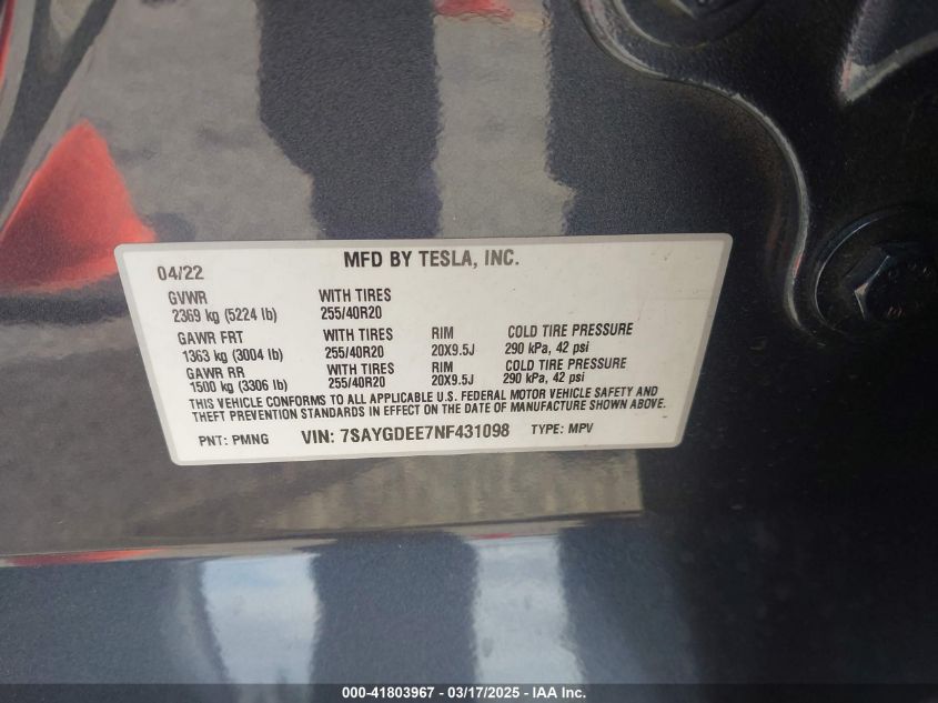 2022 TESLA MODEL Y | 7SAYGDEE7NF431098