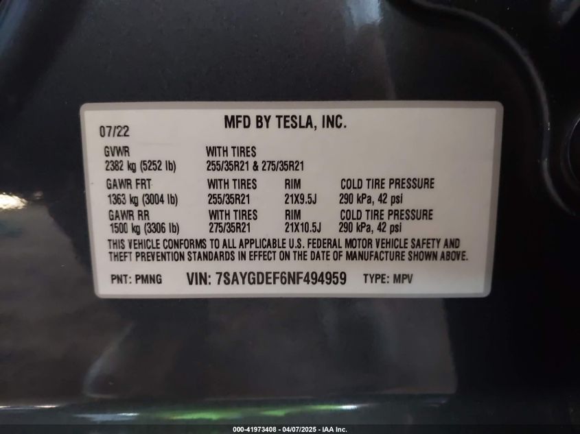 2022 TESLA MODEL Y | 7SAYGDEF6NF494959