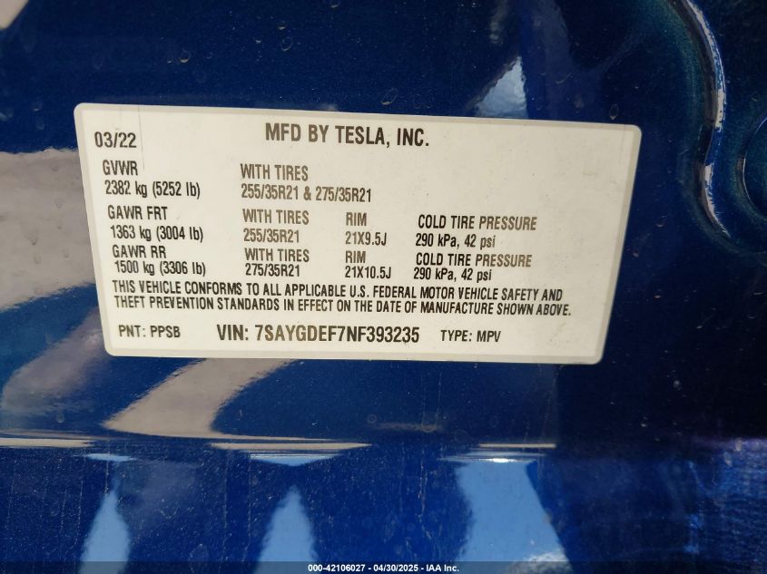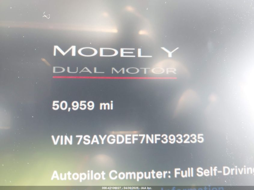 2022 TESLA MODEL Y | 7SAYGDEF7NF393235